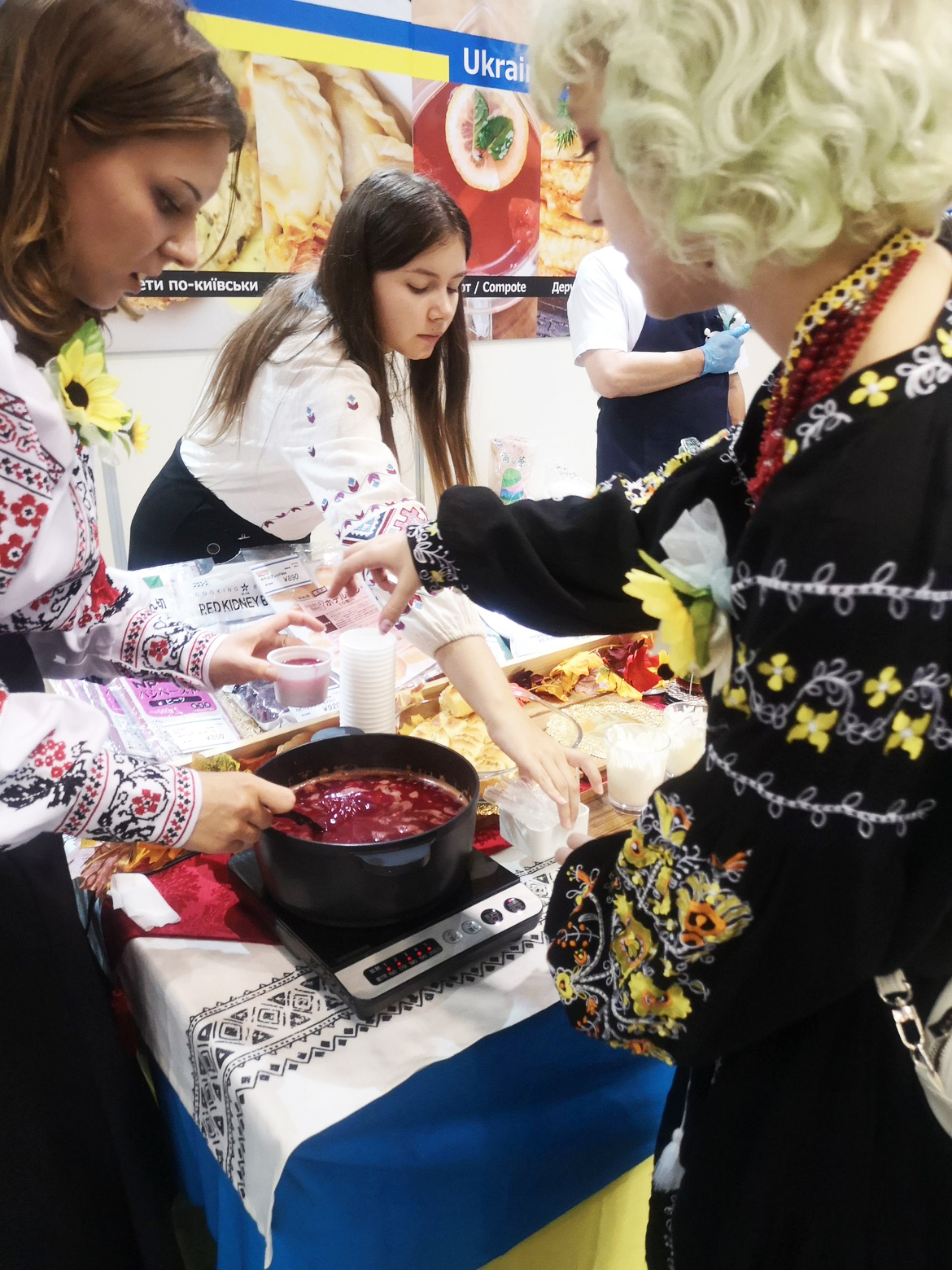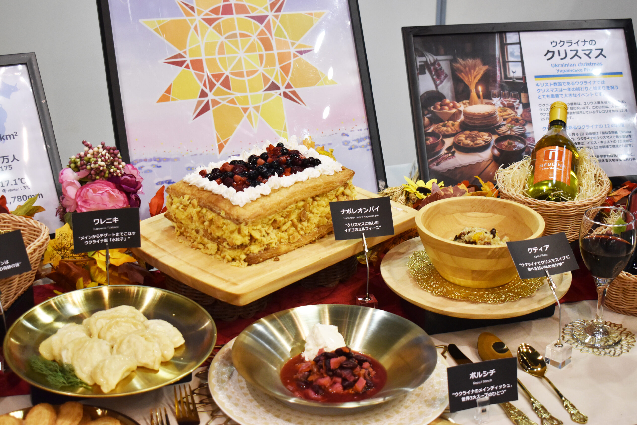 来場者に試食していただいたのは、伝統的なウクライナ料理である「ボルシチ(スープ)」、「ズラーズィ(ひき肉とマッシュルーム包み焼き)」、「ナリスニキ(主にカッテージチーズとレーズンを挟んで巻いたクレープ)」「コンポ―ト(果物とベリーを煮て作る甘くて伝統的なドリンク)」などの4品です。
